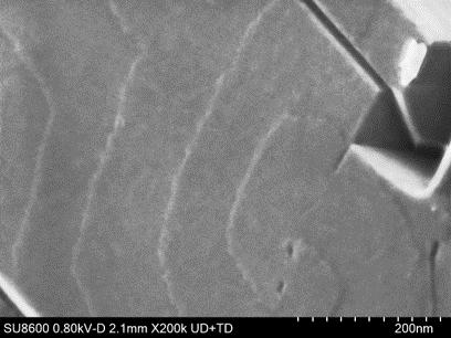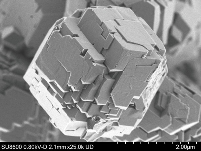 0.8 kV電壓條件下觀察RHO型沸石的實例。左圖為顆粒整體的形貌,右圖為放大圖像,顆粒表面細微的臺階結(jié)構(gòu)清晰可見。低電壓觀察對于減少電子束損傷和獲取表面形狀信息較為有效。