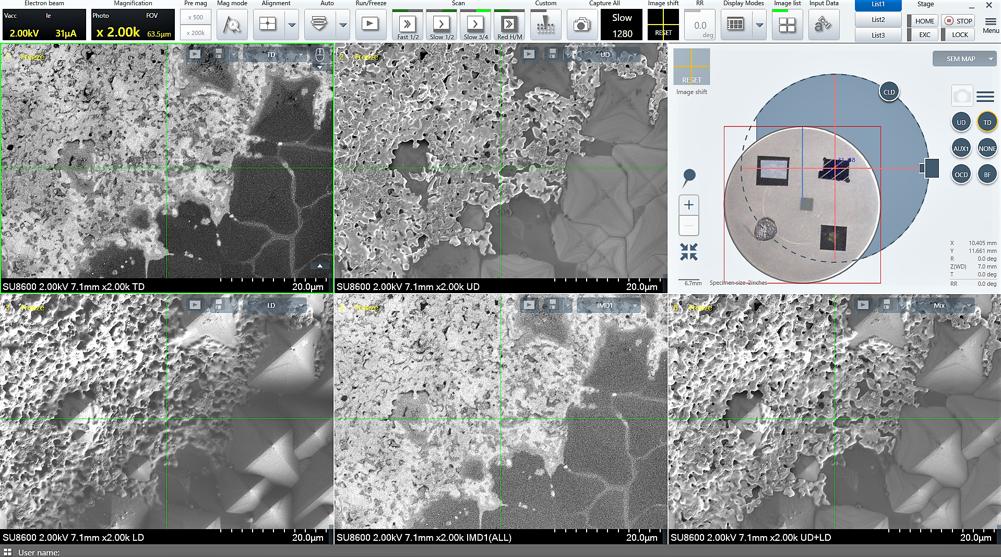 1,2,4 或6通道信號可在同一個顯示器上同時顯示,可切換內(nèi)容包括SEM各探測器以及樣品室相機和導航相機。可以通過使用兩個顯示器來擴展工作空間,可定制的用戶界面以提高工作效率。