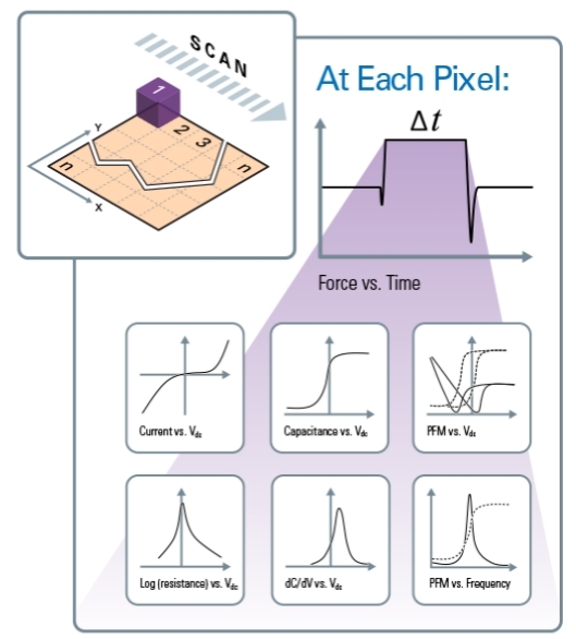 這些模式利用快速力陣列模式在每個像素點中執(zhí)行力曲線測量,并具有用戶定義的停留時間數(shù)據(jù)采集。使用高速數(shù)據(jù)捕獲功能,在停留期間執(zhí)行多種電學(xué)測量,從而在每個像素上產(chǎn)生電學(xué)和力學(xué)譜。數(shù)據(jù)立方體模式在單次測量中提供完整的表征,這在商用AFM中是聞所未聞的。