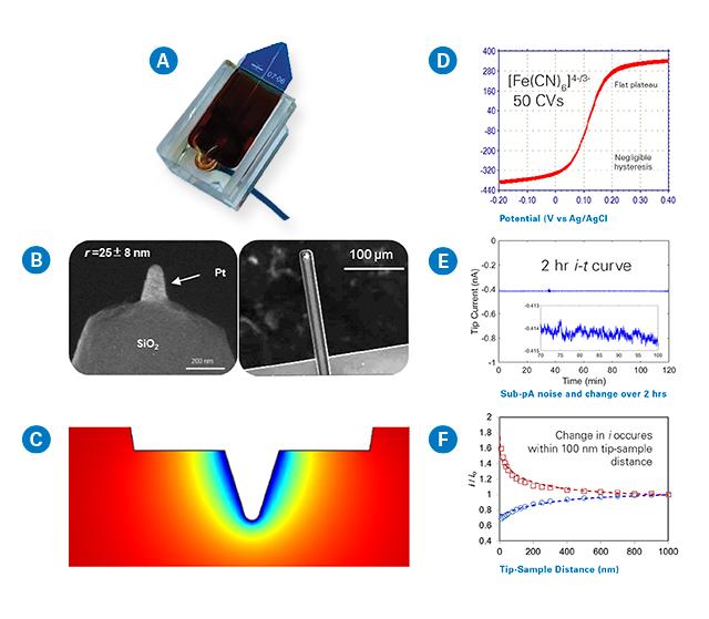 (A)布魯克獨家預(yù)裝的峰值力輕敲掃描電化學(xué)顯微鏡探針提供了簡單、安全的操控性,極致的穩(wěn)定性,在數(shù)小時成像和多次使用-清潔循環(huán)中都能保持最佳分辨率。(B)探針的掃描電鏡圖像;(C)使用COMSOL模擬的在10mM[Ru(NH3)6]3溶液中的針尖電化學(xué)電流分布;(D) 從 50 次連續(xù)掃描中挑選的第 1、25 和 50 次循環(huán)伏安掃描譜,掃描速率為20 mV/s;(E)長達(dá)2小時的恒流測試,以Ag/AgCl為參比電極。(F)模擬(虛線)和實驗(實線)獲得的接近曲線。C和E圖像由 加州理工的C. Xiang和 Y. Chen提供。