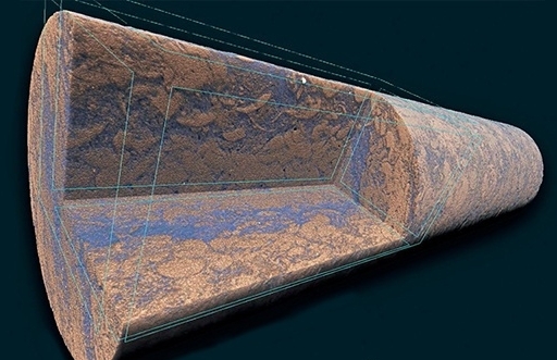 200mm長碳酸鹽巖心的三維渲染圖,分辨率13μm